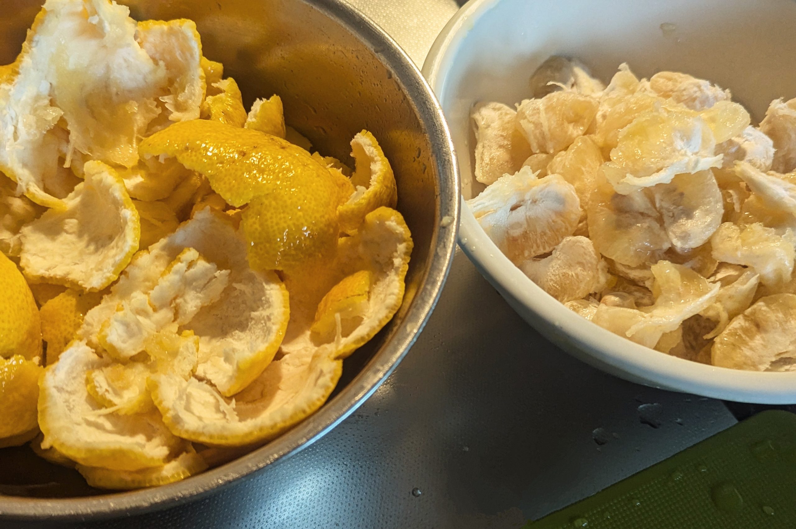 ゆずは一つ一つ流水で洗ってキッチンペーパーなどで水気をふき取ります。その後、皮をむいて身を取り出します。種がたくさんあってちょっと大変ですが、種をすべて取り除きます。