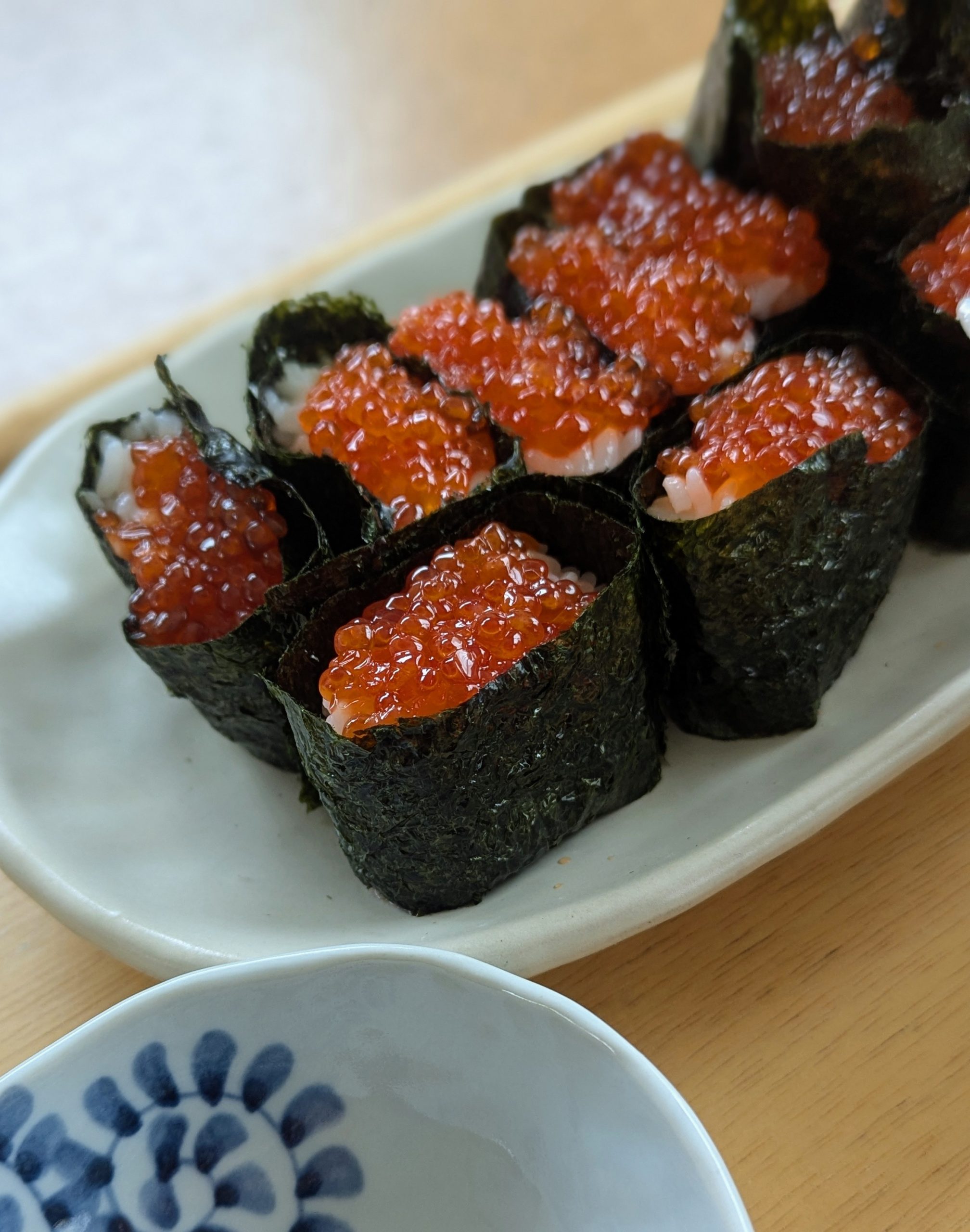 イクラがあったので、軍艦巻きにして食べました。海苔を丁度いいサイズにするのが意外と難しい。。。
