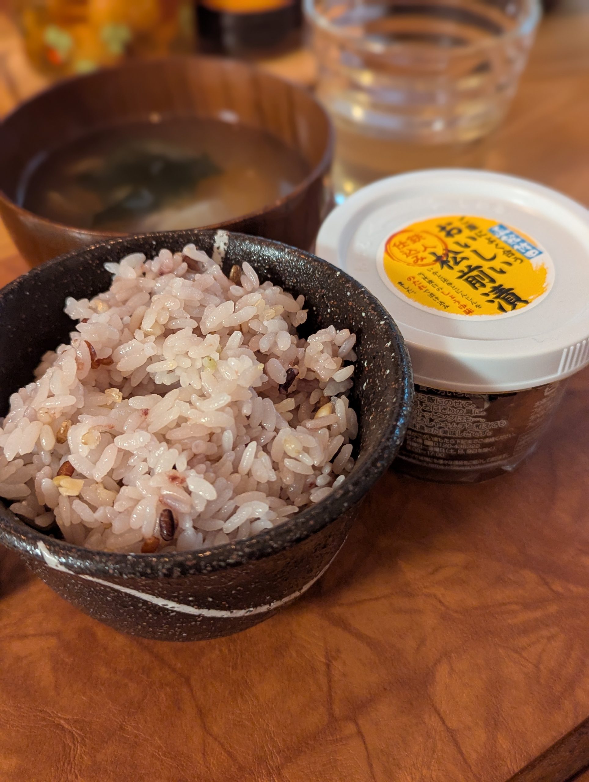 セコマでも売っている《おいしい松前漬け》、16種類の雑穀米、ネギとわかめのお味噌汁で夕食
