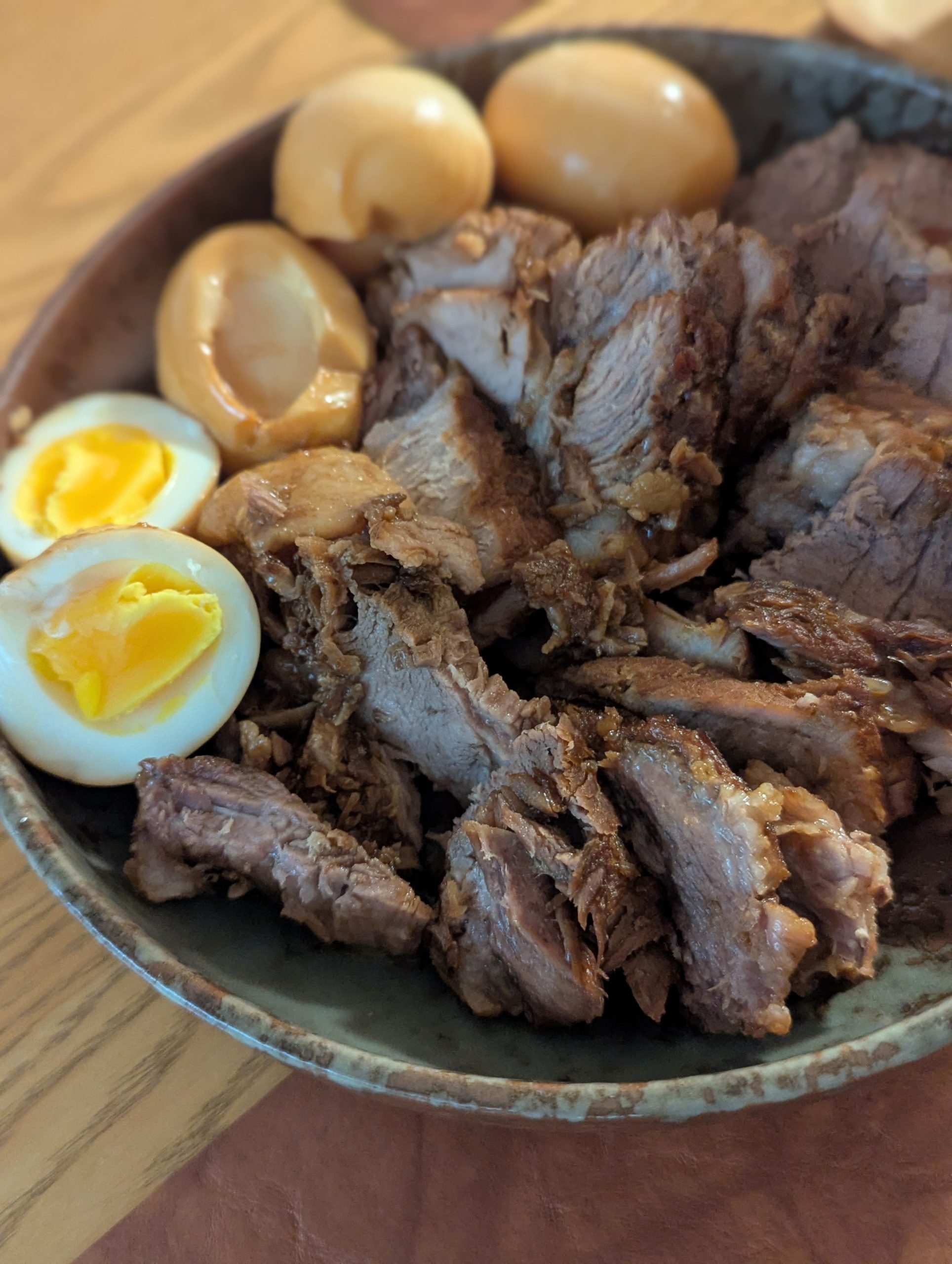 豚肉は、ヒレ肉やロース肉のブロック(かたまり)を使います。圧力鍋に豚肉と調味料を投入。加圧したら中火で5分、その後火を止めて完成です