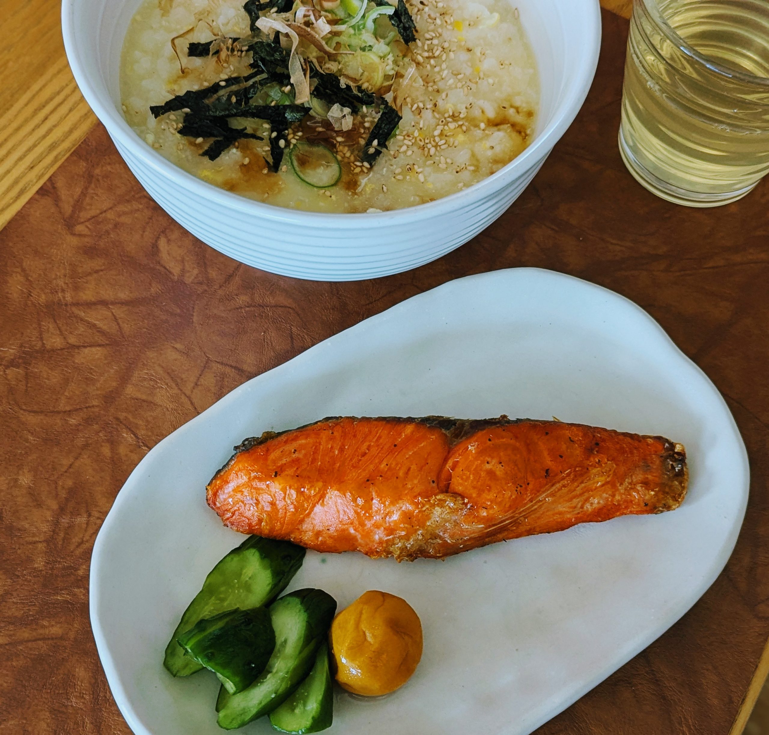 ☛余っていたご飯を雑炊に。それだけだと寂しいので焼き鮭をプラス。キュウリの浅漬けと梅干しを添えた