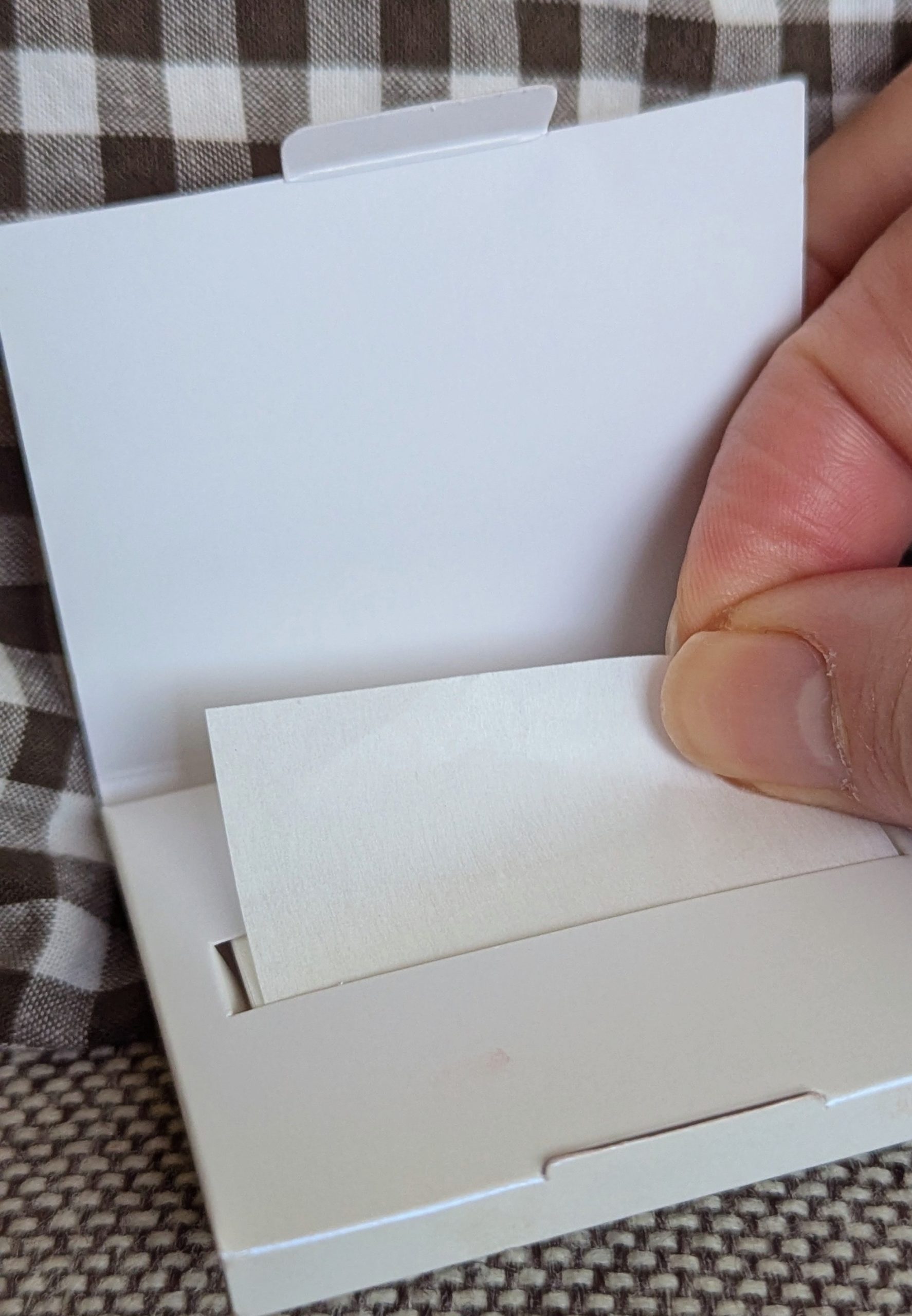 薄紙に微細なパウダーがついています。ほのかに香るおしろいの匂いにも癒されます