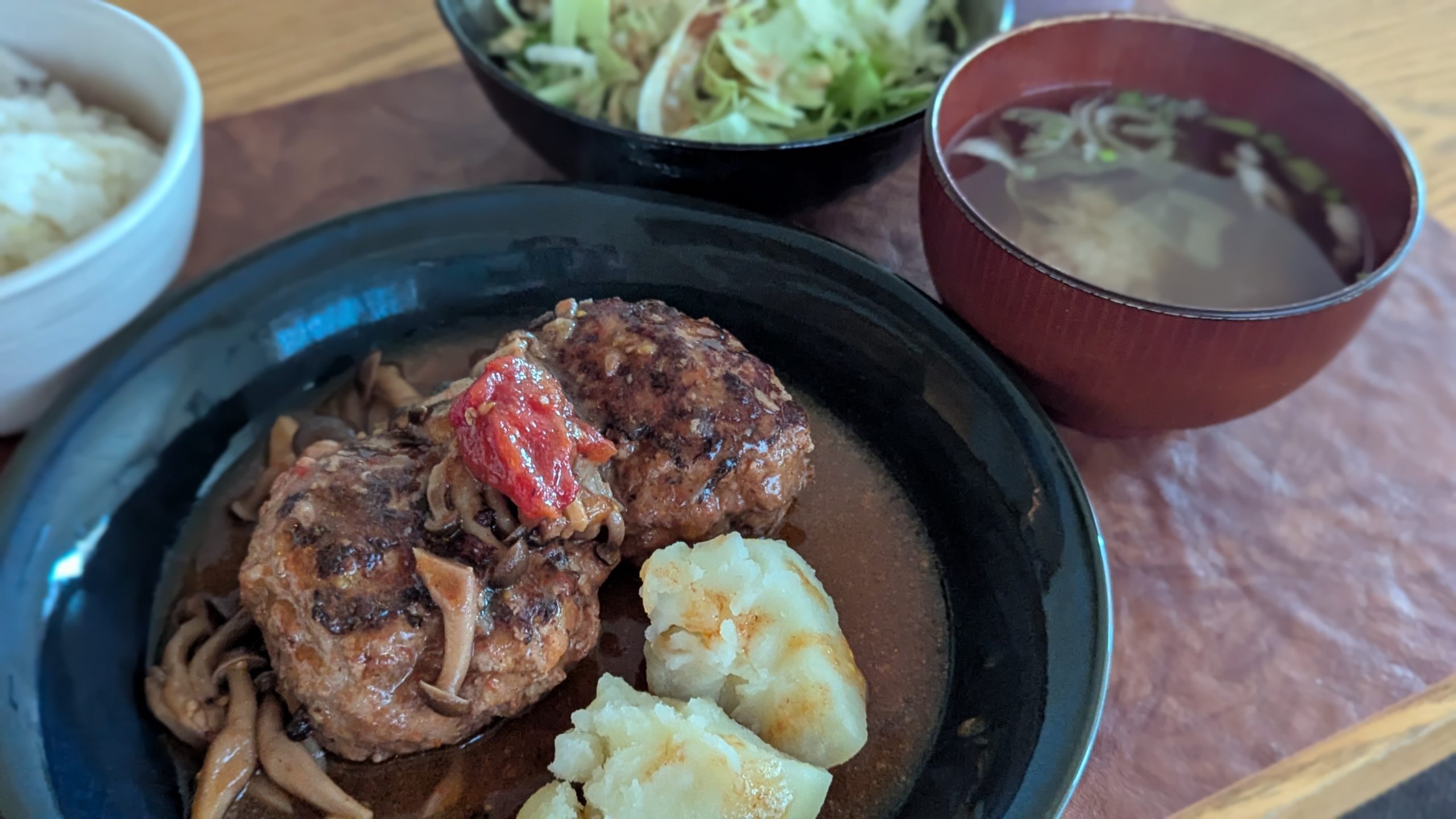 今夜は煮込みハンバーグです。付け合わせはふかしたジャガイモ。ソースにはフレッシュトマトを入れてます