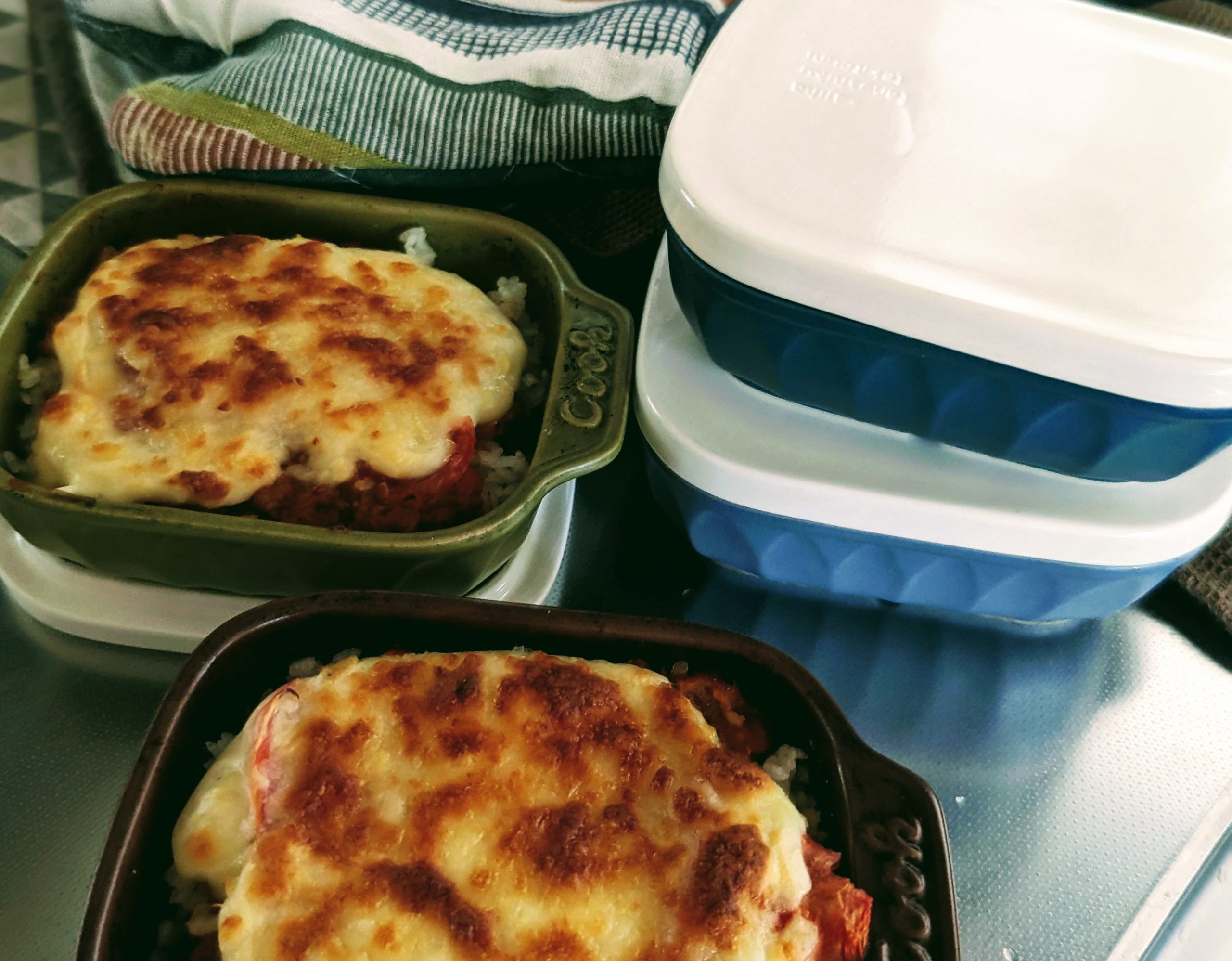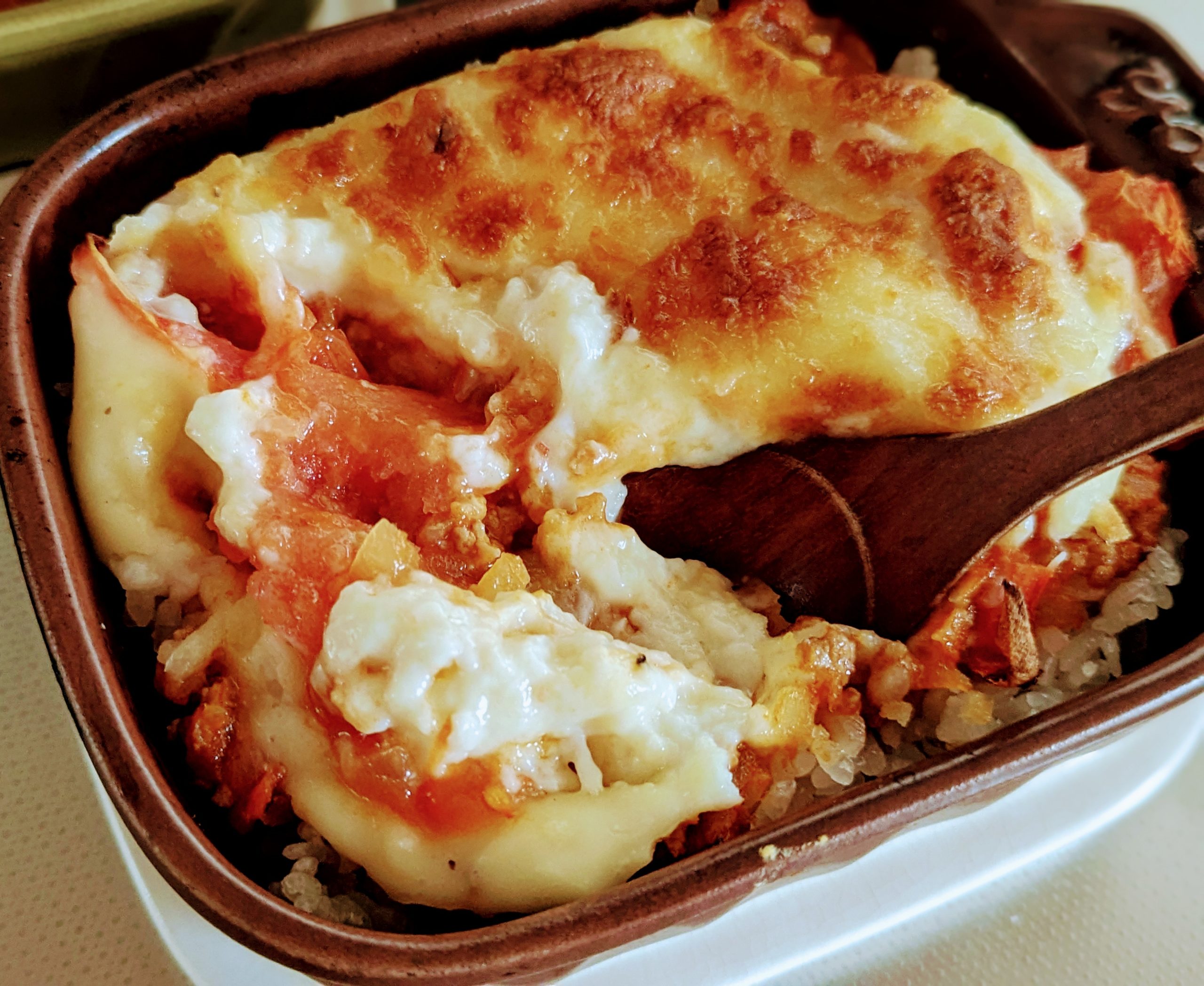 ご飯、ミートソース、ホワイトソース、トマトものせて、、、溶けるチーズもたっぷりと🧀