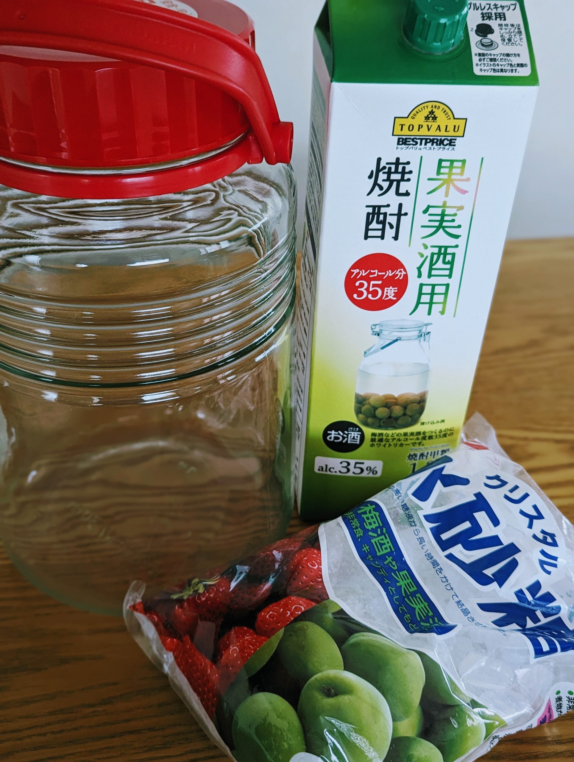 密封容器に梅、氷砂糖(500g位)、果実酒用リカーを注ぎ入れます