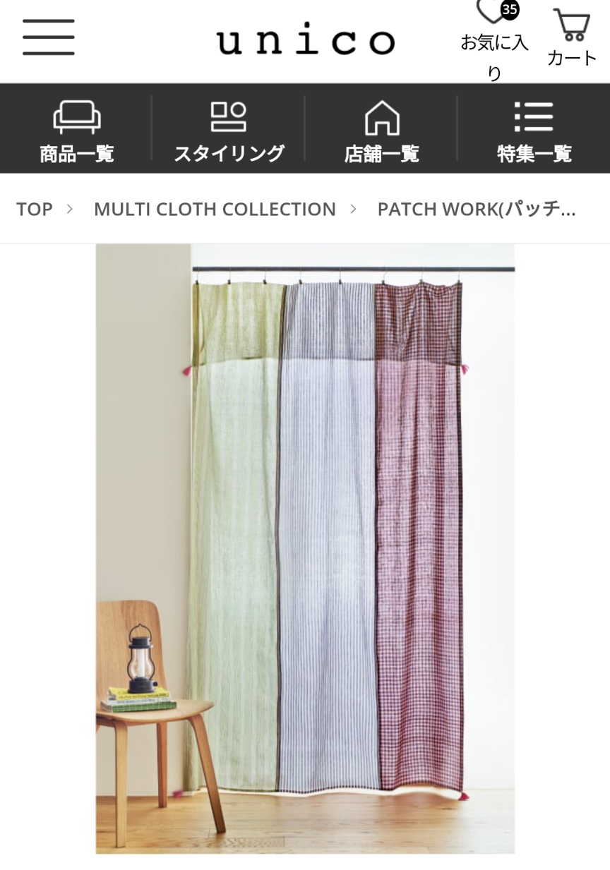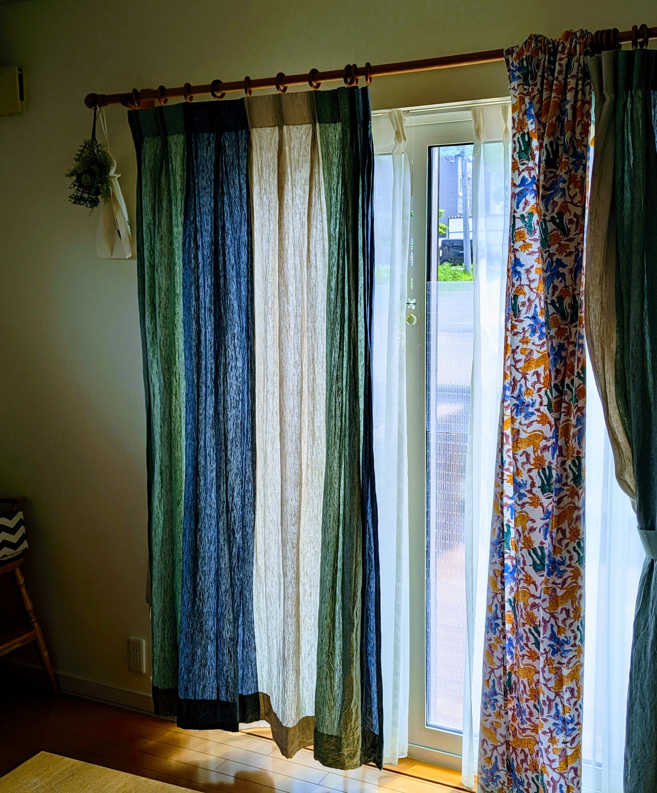 unicoのマルチクロスを使用。縦に長いので半分にカットして2枚仕立てにしました。カーテンクリップで吊るしています