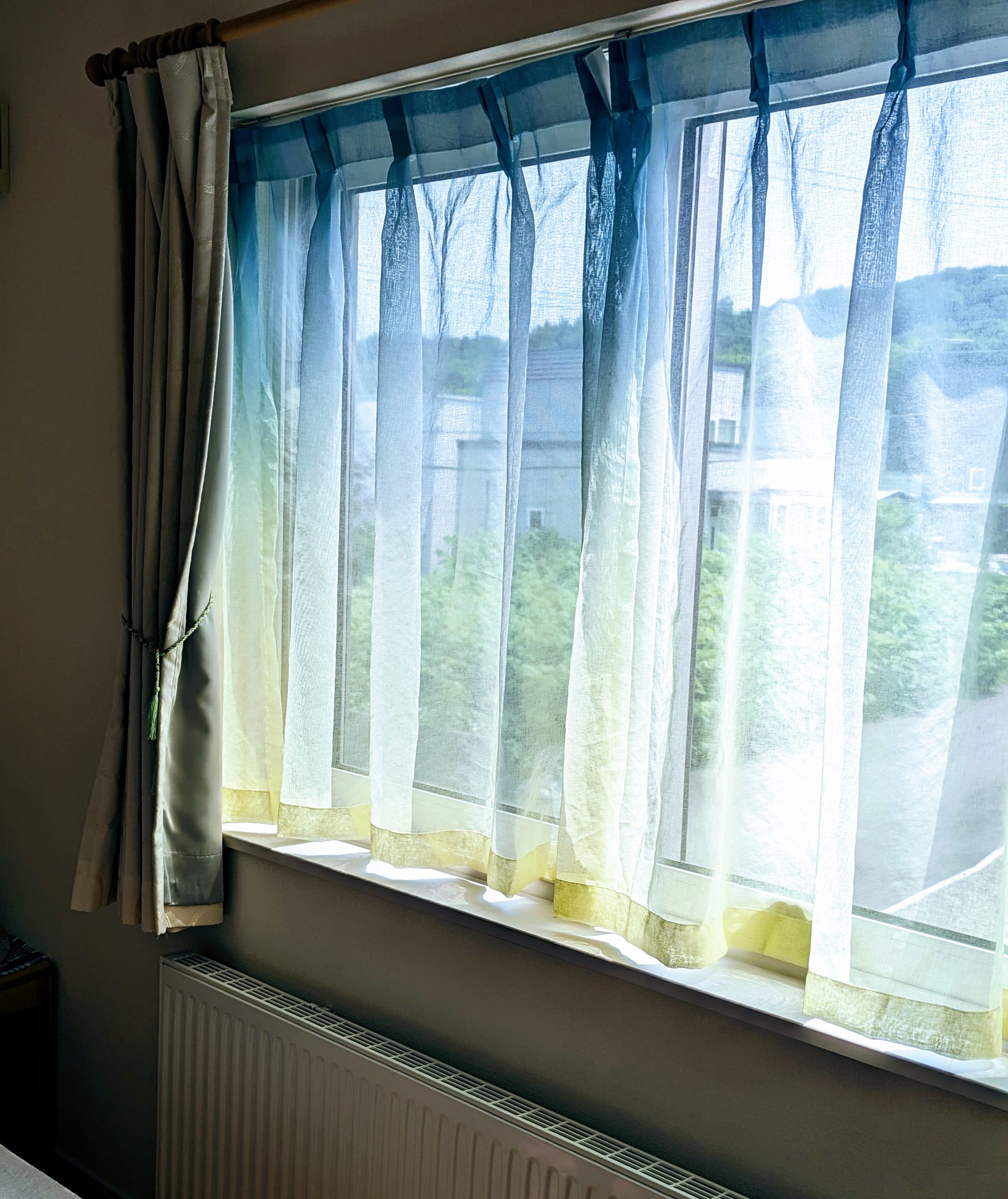 寝室のレースカーテンはブルーとグリーンのグラデーション。