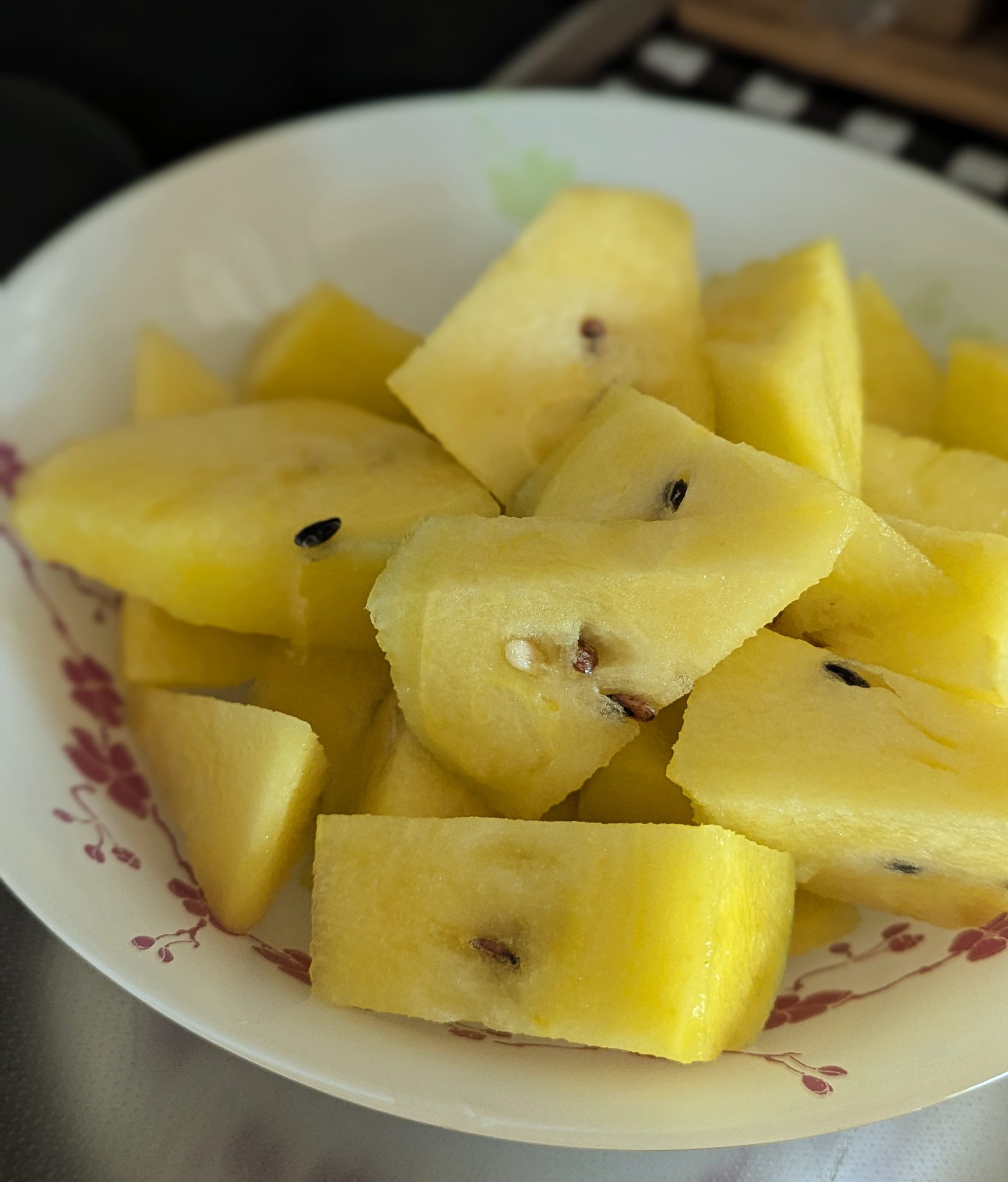 黄色いスイカって食べたことなかったのですが、めちゃくちゃみずみずしかった♬ 北海道の北竜町の特産品「ひまわりすいか」だそうです。