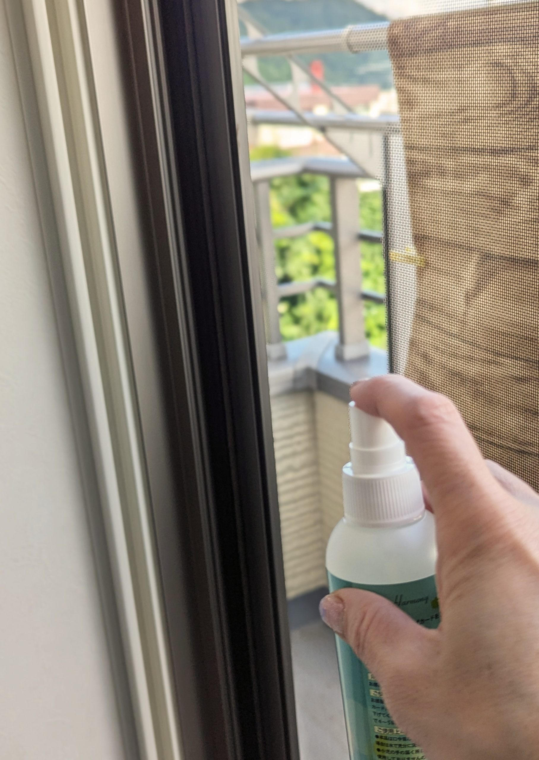 早速、網戸に吹き付けてみます。きめ細かいミストがフワッと広がって、成分がまんべんなく行き渡りそうです。香りも柔らかく、爽やかな植物のいい香り! アロマのようなリラックスできる香りです