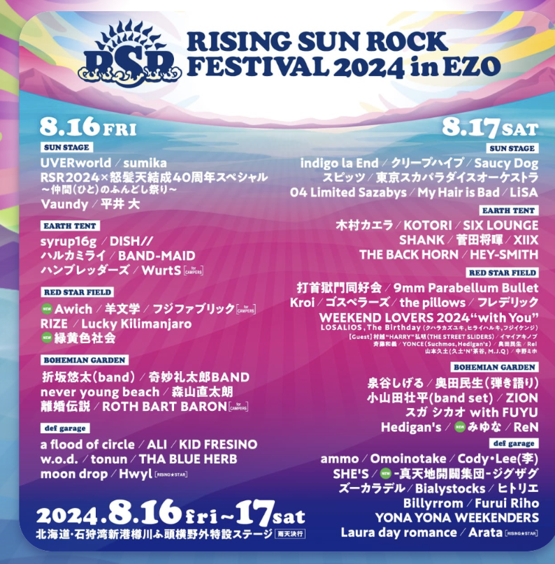 夏フェス好きですか? 音楽は好きなのですが、野外の夏フェスは体力的にきついので敬遠していました、、、。ですが、17日㈯。。。初めてRSR “RISING SUN ROCK FESTIVAL 2024 in EZO”に参戦してきました