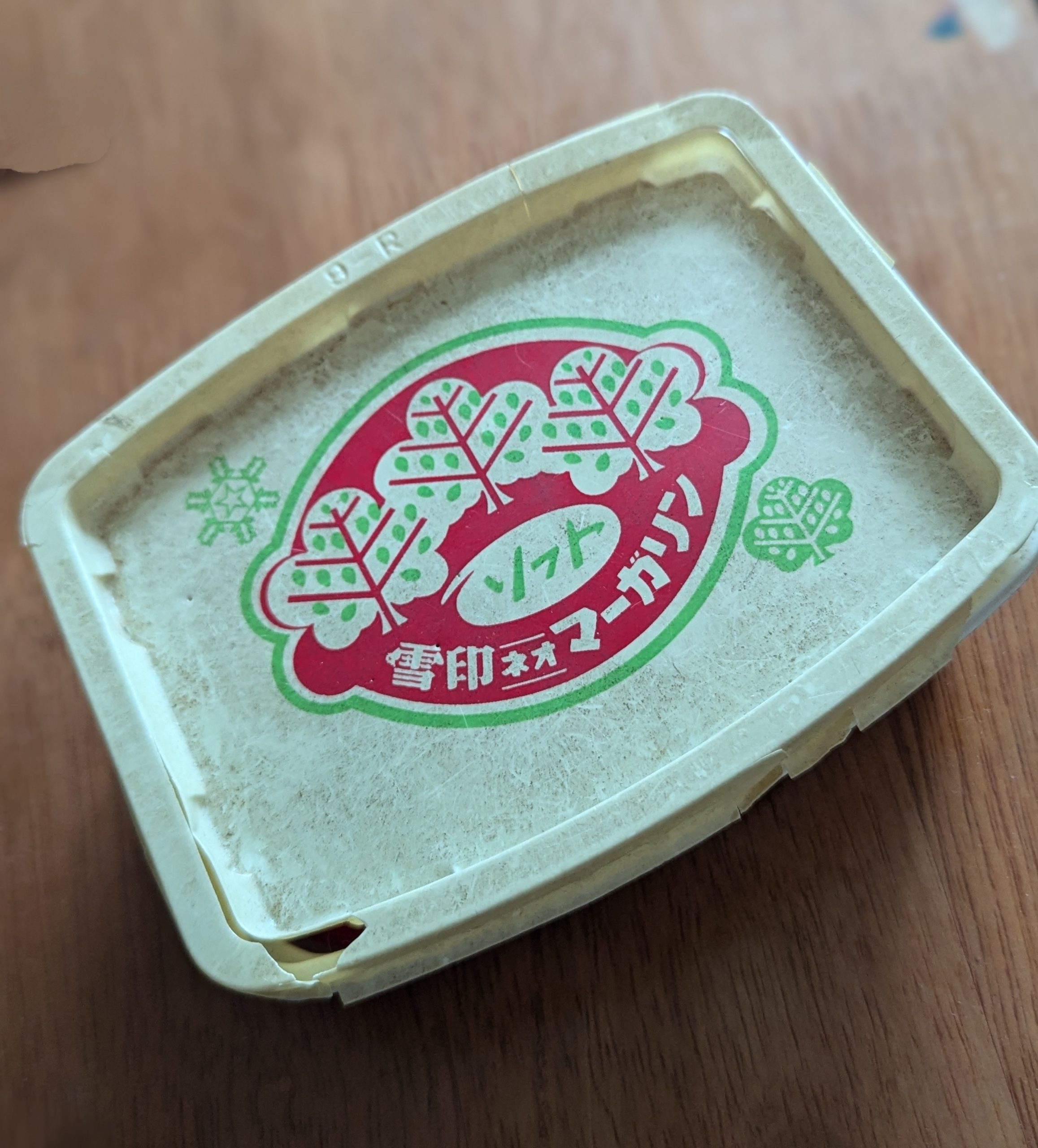 母の裁縫箱から見つけました。マーガリンの容器を、裁縫に使うこまごました物を入れるのに使っているようです。昭和レトロなデザイン可愛い♪