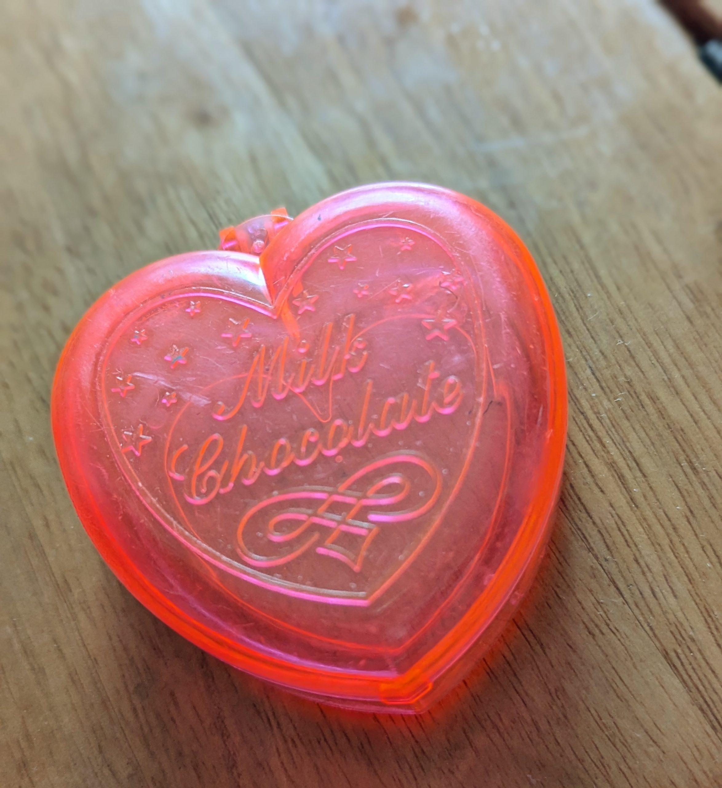 お菓子の容器かな、、“MILK CHOCOLATE”って書いてあるようです。このピンクの色合い、イチゴソーダみたいにポップなカラーでかなり良い!当時、ビーズやアクセサリーなどを入れるのに使っていた記憶があります