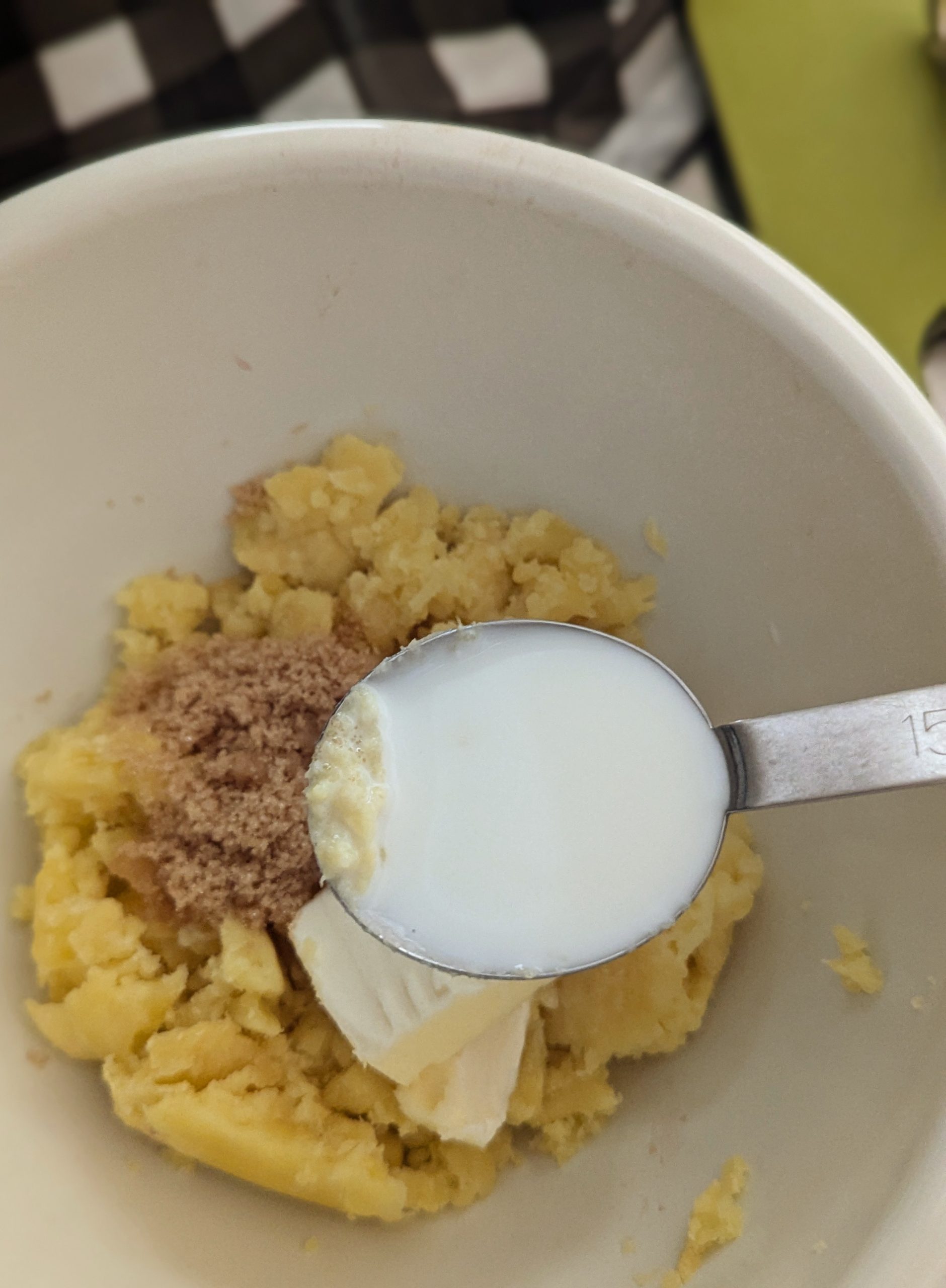 きび砂糖大さじ1、牛乳大さじ1~2、バター10グラムを加えて、滑らかになるまで混ぜます