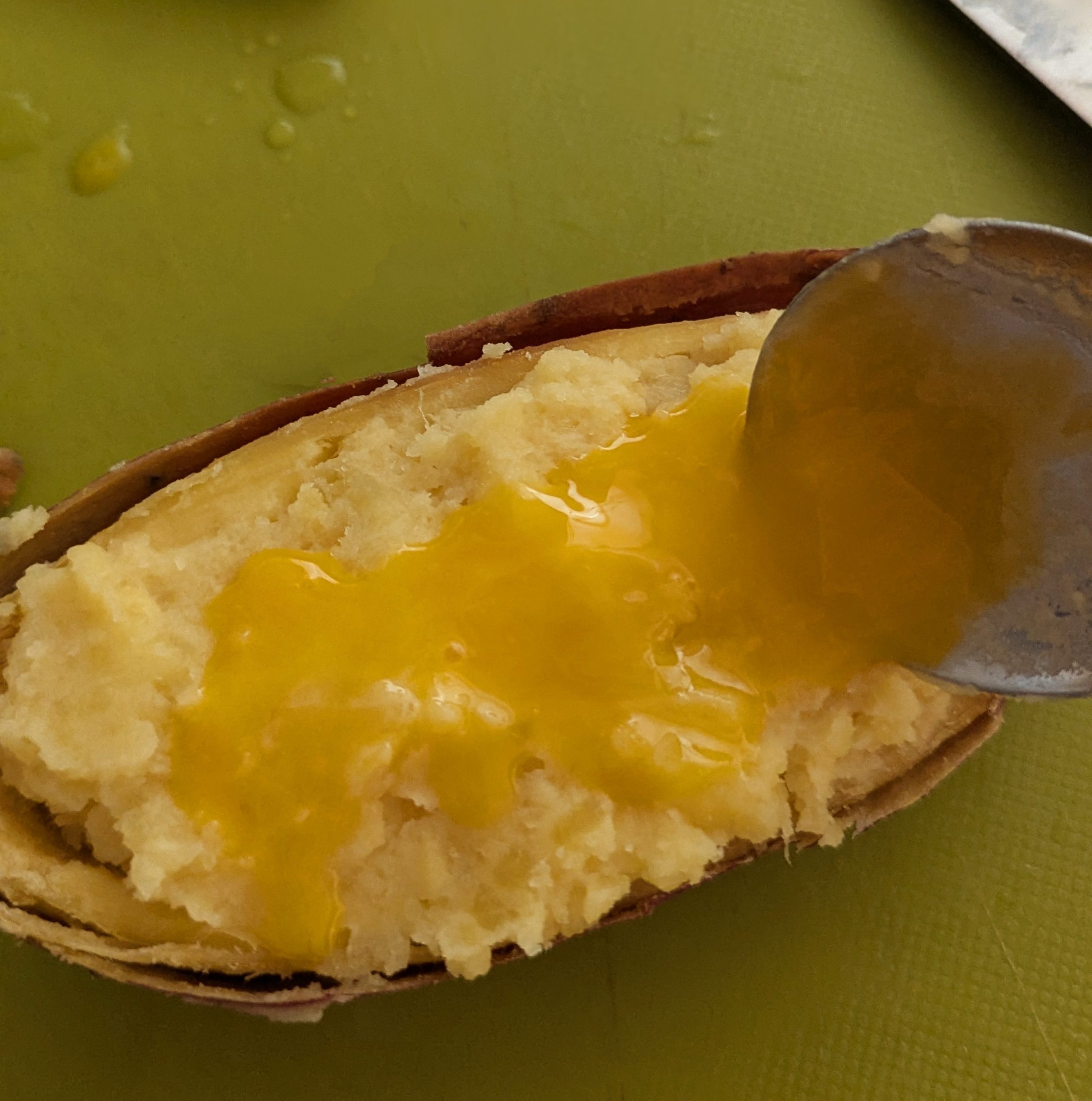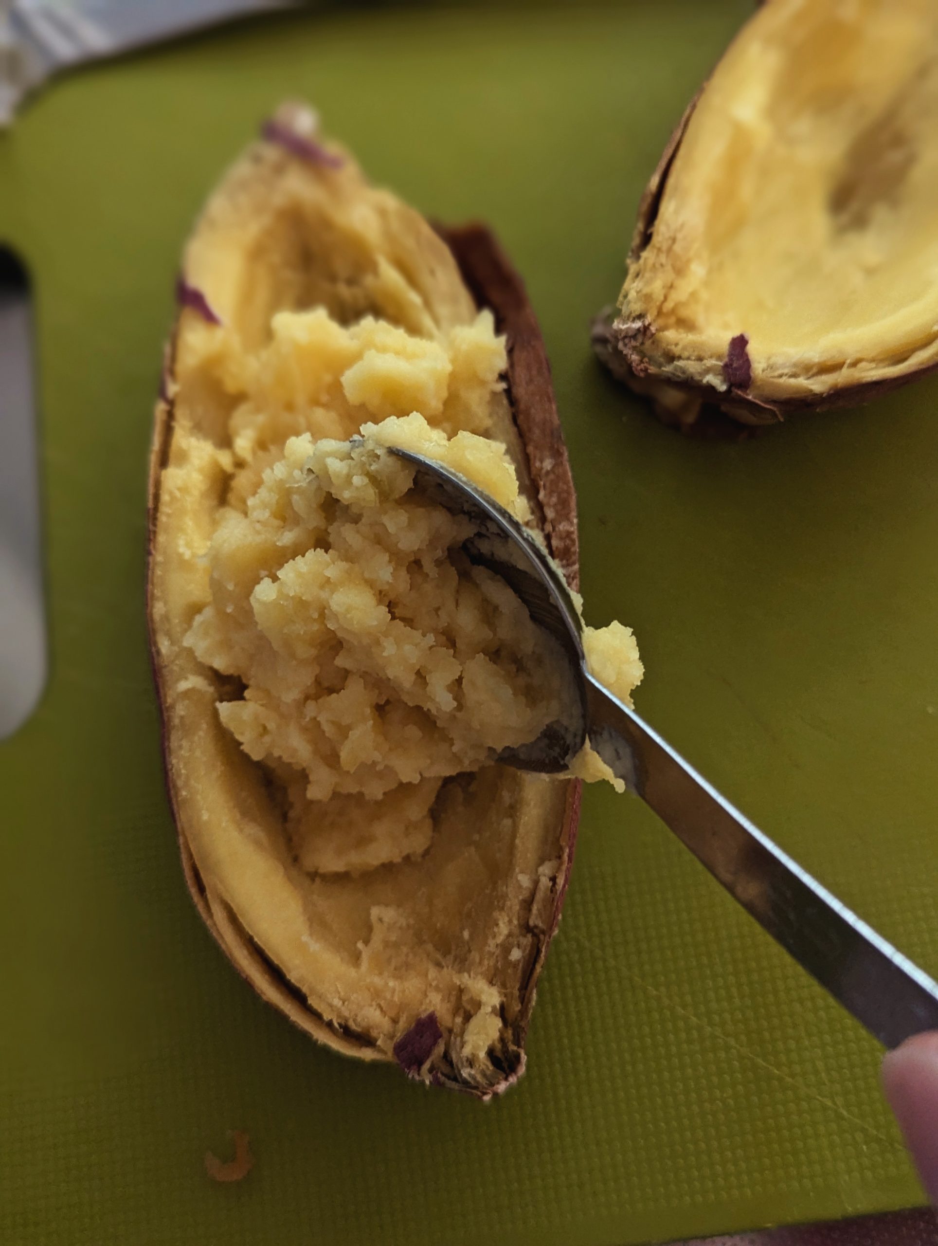 電子レンジで加熱して柔らかくなったサツマイモを、端っこを少し残してくりぬきます